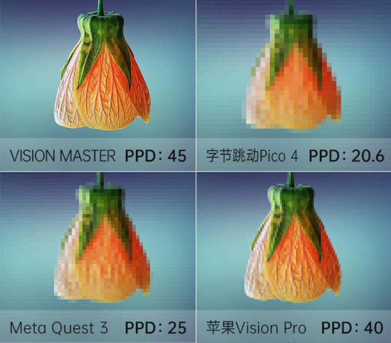 PPD(Pixels Per Degree)角分辨率: 指视野范围内的每1夹角看到的像素点数量。要保证人眼看到的屏幕画面足够清晰,PPD需要达到60.头戴显示类产品,PPD数值越接近60,看到的显示画面越清晰。图中仅为示意,不是实际显示效果。