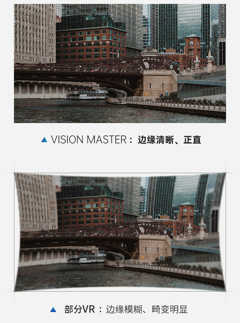 VISION MASTER 通过 12 片光学镜片的无间配合,精密的光学设计优化,通过纯光学系统设计,将屏幕整体畸变严格控制在 2% 以内,达到难以置信的<0.03%/度,几乎可以忽略的水平,实现行业蕞佳的畸变控制。