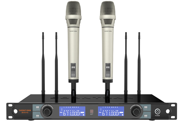 SK18-43 一拖二真分集手持 KCHYRS (卡尔斯)金属外壳的1U标准机柜设计结构,双通道接收;采用自动选讯接收方式,使接收断音降到最低;具有先进的频率自动扫描功能(Auto Scan),可以在工作的环境中快速搜寻并锁定不受干扰的频率